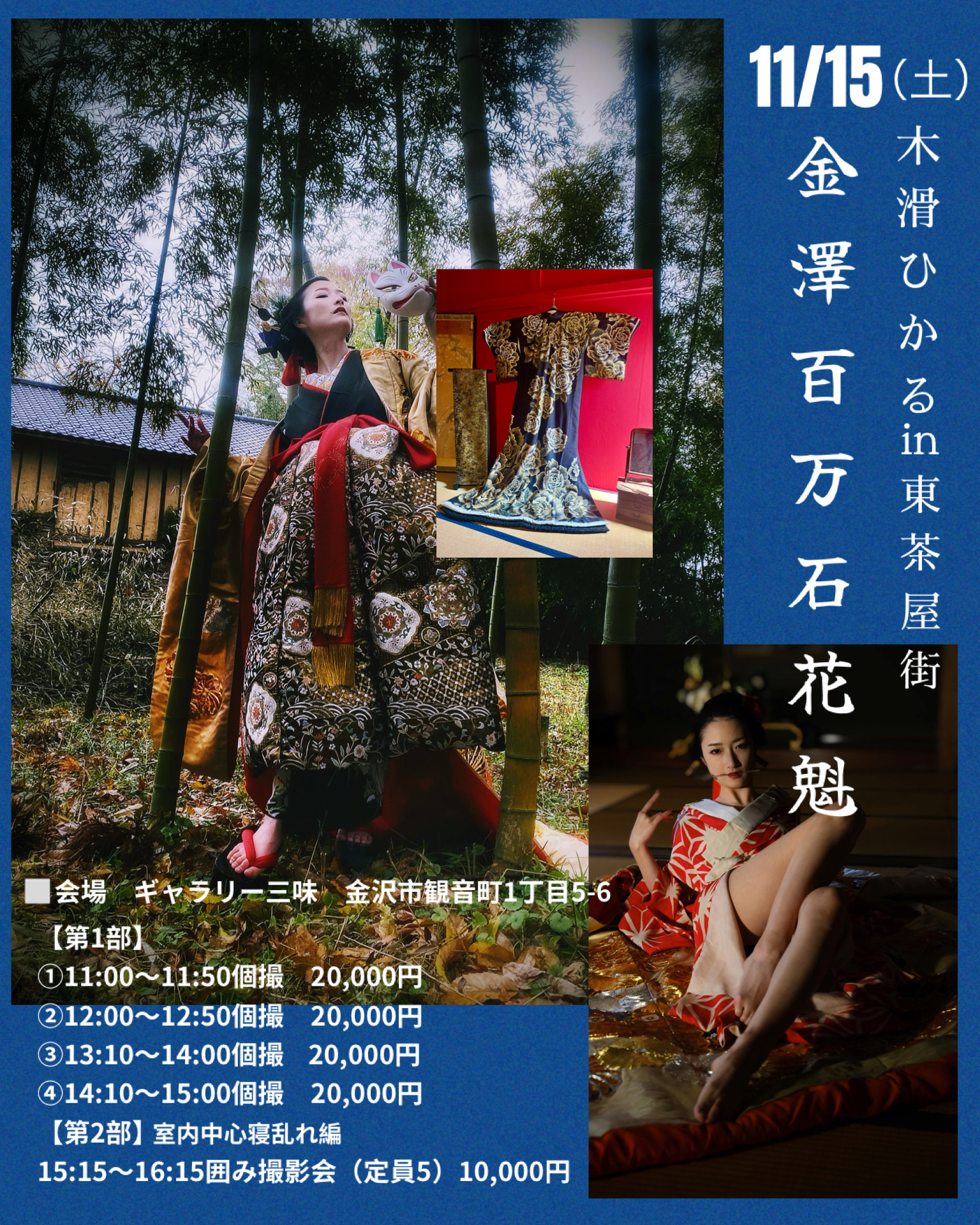 木滑ひかる初の金沢登場! 金沢東茶屋街の街並みと古民家の一室 花魁衣装からの襦袢寝乱れシーンの撮影となります。 受付 10分前(14:50) 会場 ギャラリー三味 金沢市観音町1-5-6 https://maps.app.goo.gl/5KxYR961bGtJzgbT8?g_st=ipc レフ、LED補助あり、囲み撮影スタイルで順撮りタイム設けます。小物等のお持ち込みも歓迎いたします。