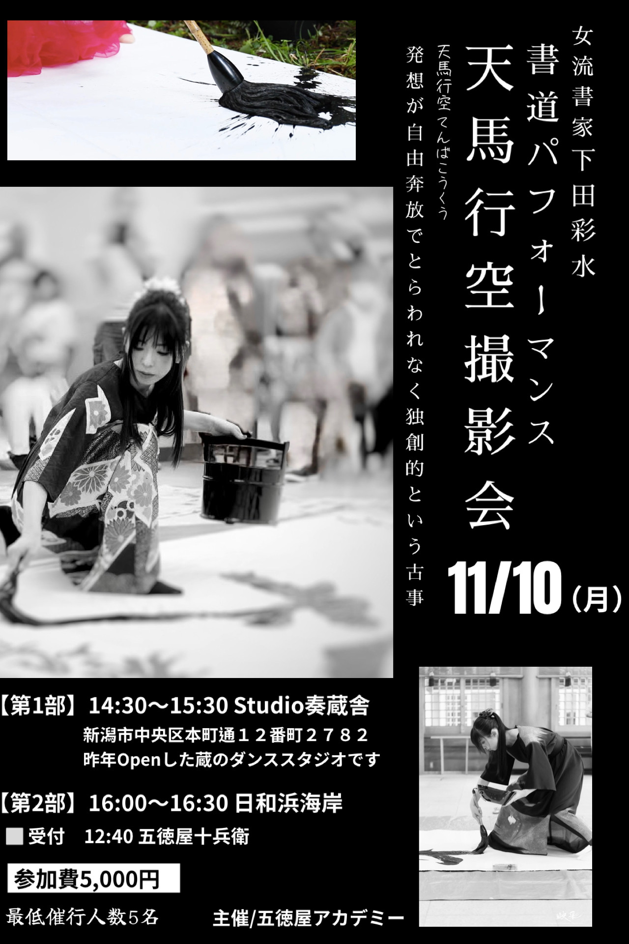女流書道家の彩水さんを迎えて、来年の干支にちなんだ書を書いていただく撮影会を開催いたします。 ▪️会場 1部 Studio奏蔵舎 https://maps.app.goo.gl/fmrTWGvXhU36tQ2Y9?g_st=ipc 2部 日和浜 ▪️時間 1部 14:30〜15:30 2部 16:00〜16:30 ▪️受付 五徳屋 14:15 最低催行人数5名に満たない場合は中止といたします。