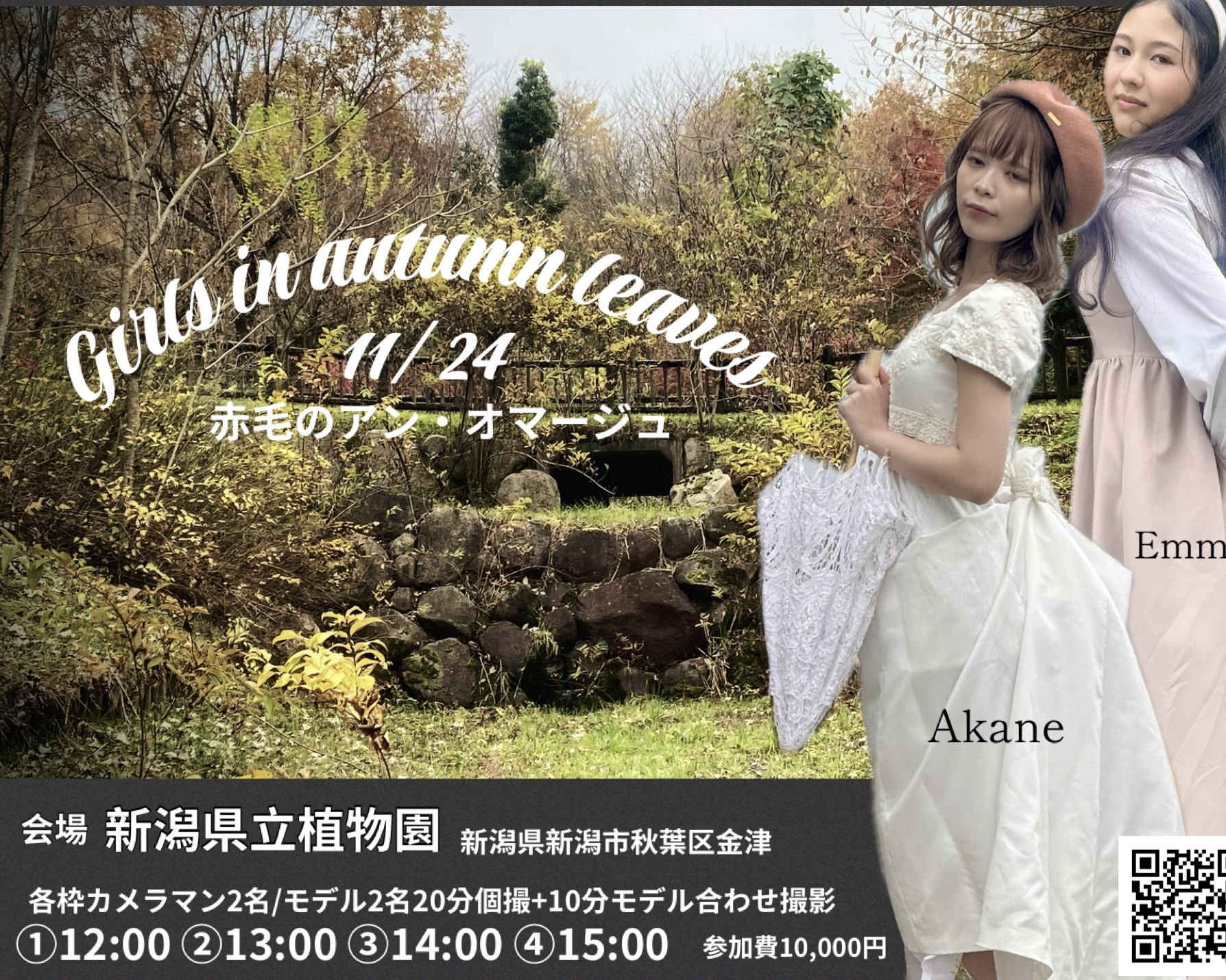 赤毛のアンをオマージュした2人の少女の撮影会です。 各枠20分毎に1名のモデルを撮影、後半10分は2人合わせの撮影となります。 受付集合は現地、広い敷地のため当日、各自にご連絡いたします。 雨天の場合は中止といたします。 各枠カメラマン2名のため、調整させていただく場合もございます。宜しくお願いいたします。