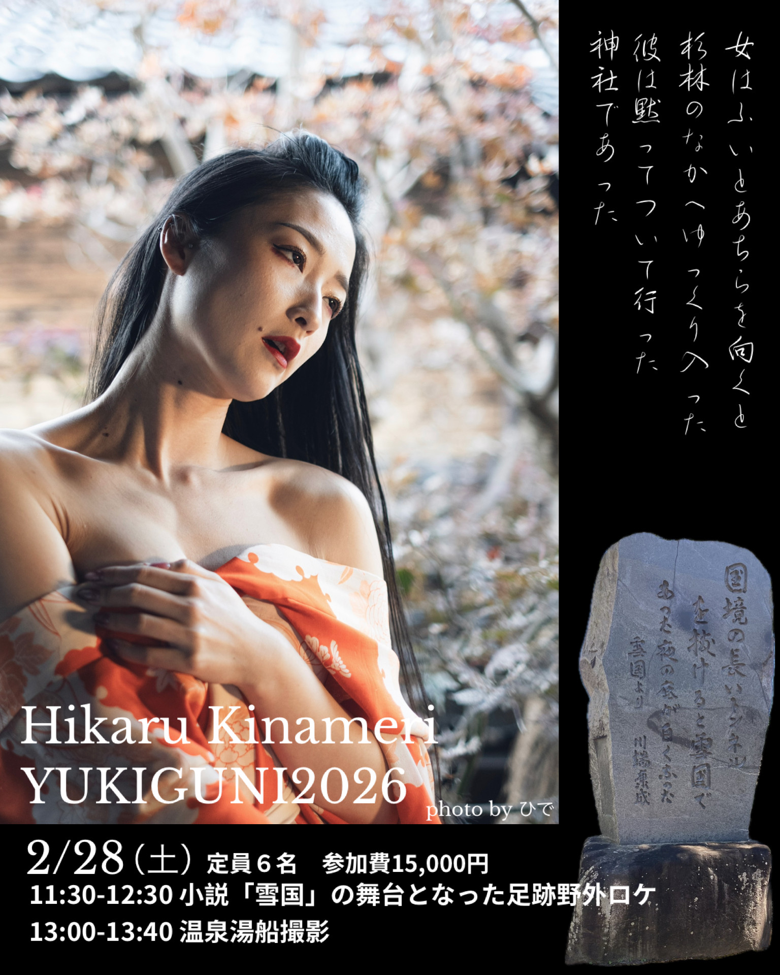 川端康成が小説雪国の構想を練った神社周辺でのロケ撮影と襦袢姿での温泉湯船撮影となります。特にこの時期、越後湯沢温泉での撮影は貴重です。 集合は11:20 諏訪社 新潟県南魚沼郡湯沢町湯沢858 https://maps.app.goo.gl/SewY6A3woHN9EcXA8?g_st=ic 11:10湯沢駅からタクシーにて同乗も可能ですので、JRにてお越しの方はその旨ご連絡ください。