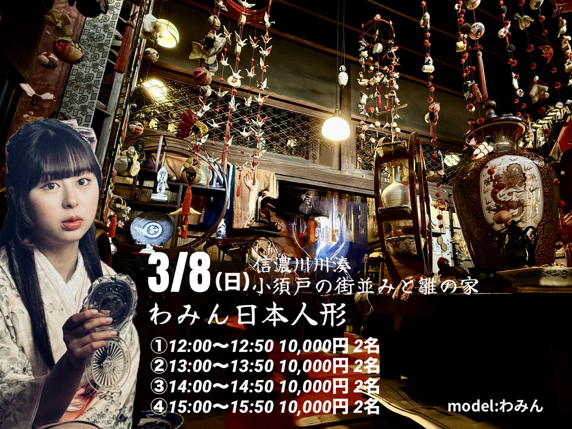 恒例の小須戸のひな祭り。 妻入りの街並みや、骨董コレクションの館「雛の家」での撮影を楽しみます。 各枠2名1グループとなります、1名の場合は 撮影時間を40分とさせていただきます。 集合は雛の家に10分前 *参加費には入館料・撮影使用料が含まれます